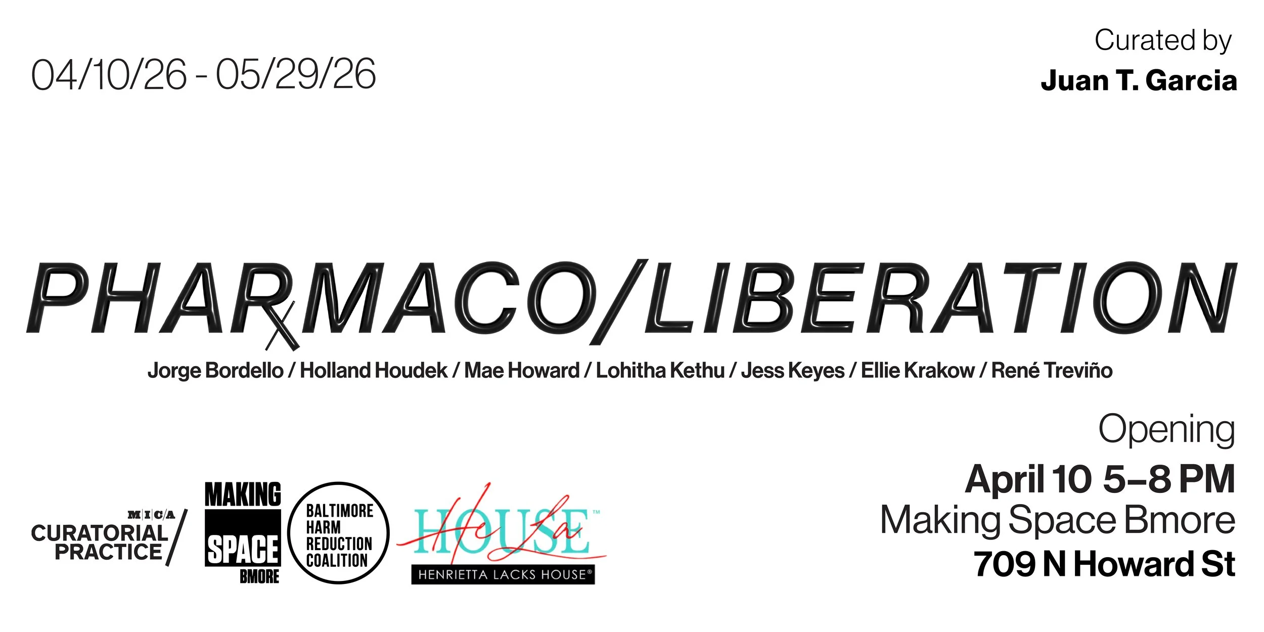 Juan T. Garcia is a curator and educator working at the intersection of the health humanities and contemporary art. He holds a BS in Biomedical Sciences from the University of Alabama at Birmingham and is a candidate for an MFA in Curatorial Practice at the Maryland Institute College of Art (MICA); he also studies at Johns Hopkins University as a visiting student. Pharmaco/Liberation is presented as a culmination of Garcia’s inquiry into curation as tactical biopolitics, and as a potent means of intervening in the contemporary governance of life.